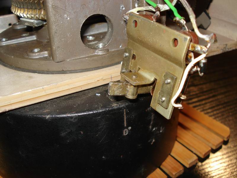 Разобрал, выяснил как работает ограничитель: На главном червячном колесе азимута есть штырек. Этот штырек отклоняет в одну или другую сторону коромысло, давящее на концевики.